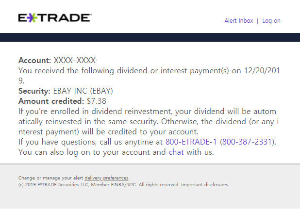 이트레이드(etrade)에 보유한 주식중 배당을 해주는 주식은 배당일에 맞춰 배당금이 입금됩니다.