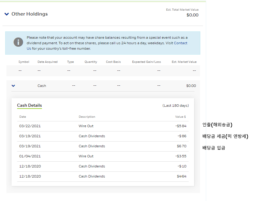배당소득을 신고하려면 내역을 정리해야 하는데 이트레이드는 아래와 같이 최근 6개월(180days)만 있습니다.. 내역에 Cash Dividends가 배당금 항목인데 날짜순으로 보면 입금과 동시에 세금을 떼어갑니다. (아래 금액은 일부 지웠기에 정확히 파악은 힘드시겠지만 내역이 이런식으로 보이는 구나~~로 봐주세요)