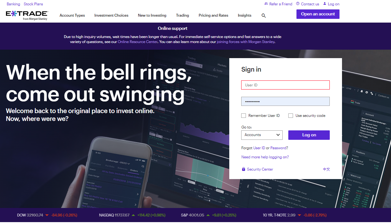 (최근 이트레이드(Etrade)는 모건 스탠리에 인수 되면서 기존 녹색 홈페이지가 보라계열로 변경되었다. )