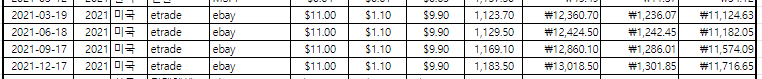 확인한 내역을 복사한 구글 시트에 일자 별로 정리한다. (환율은 날짜 입력하면 자동 계산됨)
