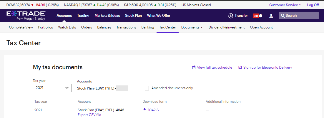 TaxCenter 로 이동하여 폼1042-S를 확인한다. (배당금이 있었으니..)
