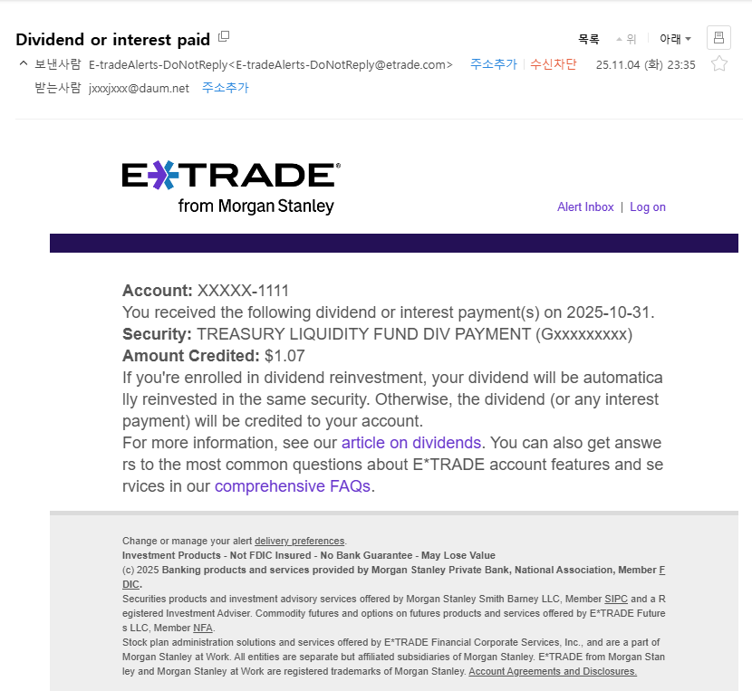 이런 주식을 매수했었나 기억이 나지 않아 뒤져보니 배당금에 대해 예금아닌 MMF에 넣어 주는 것이더라구요.